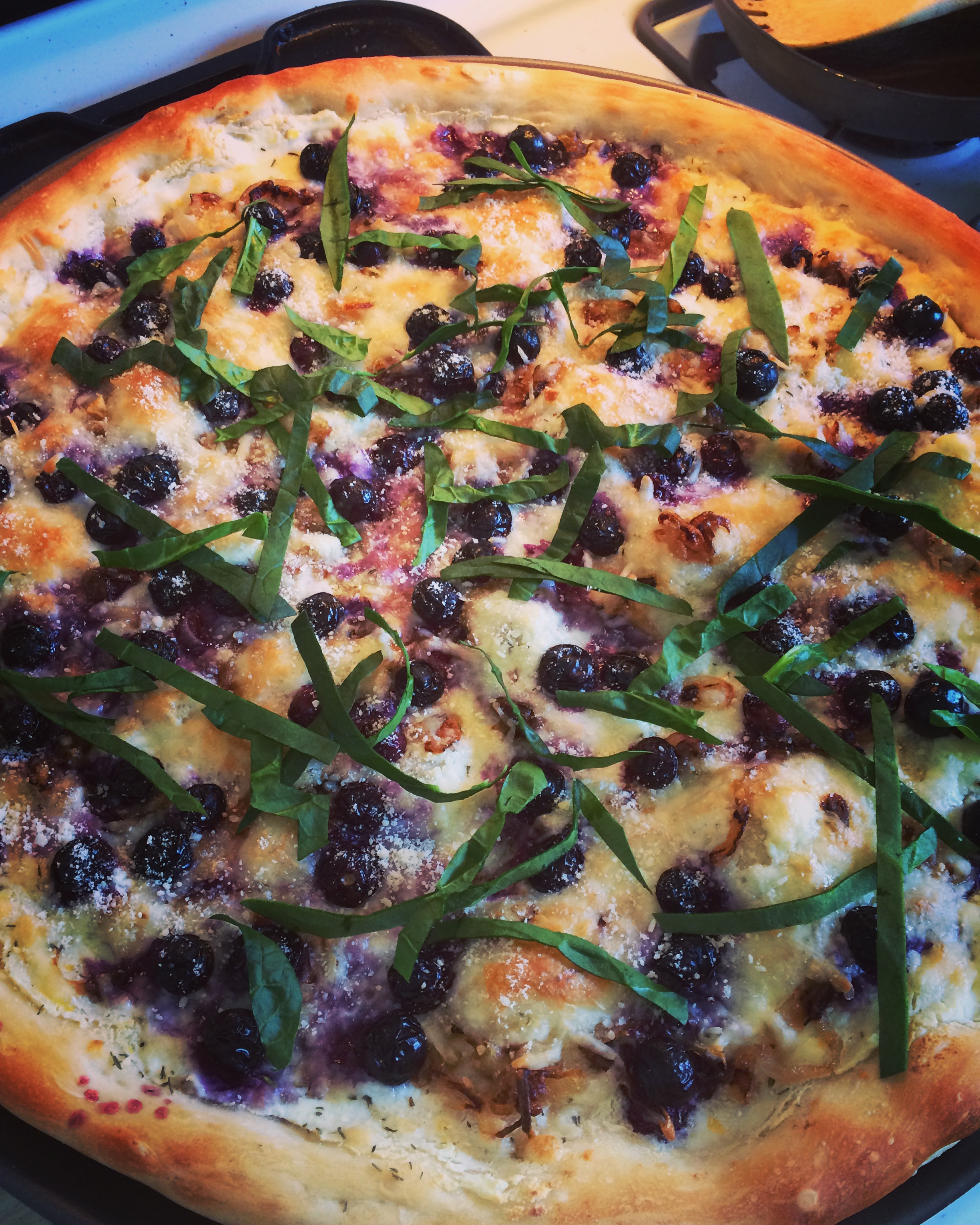 - Top with ricotta mixture, half mozzarella cheese, shallot mixture, fresh thyme, and fresh blueberries, top with remaining mozzarella.