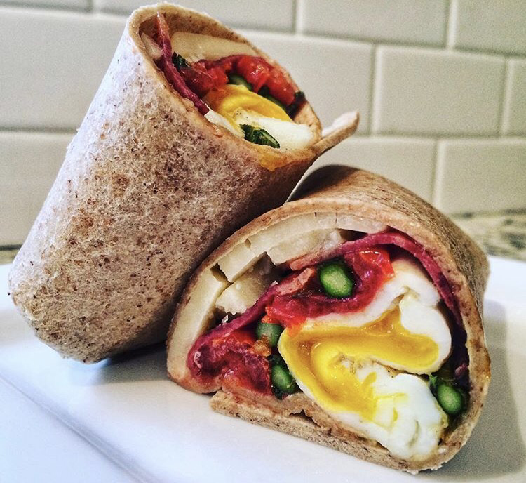 - Whole wheat wrap+2 scrambled eggs+pepper jack cheese+salsa+avocado