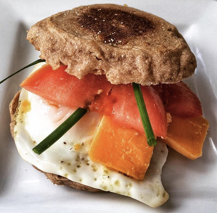 - Whole grain english muffin (toasted)+1 egg (scrambled/fried/however you want it)+baby spinach+tomato slices+cheddar cheese
